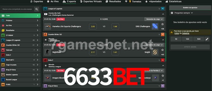 O 6633Bet oferece uma grande seleção de opções de apostas em e-sports com probabilidades competitivas